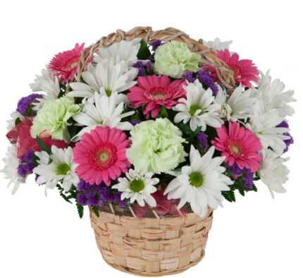 Capture the Spirit of Spring with this traditional bouquet. A handled basket holds bold purple iris and statice that defer to lemon yellow Asiatic lilies, soft yellow carnations and bright yellow daisy poms. It's the perfect petite basket to celebrate any occasion.