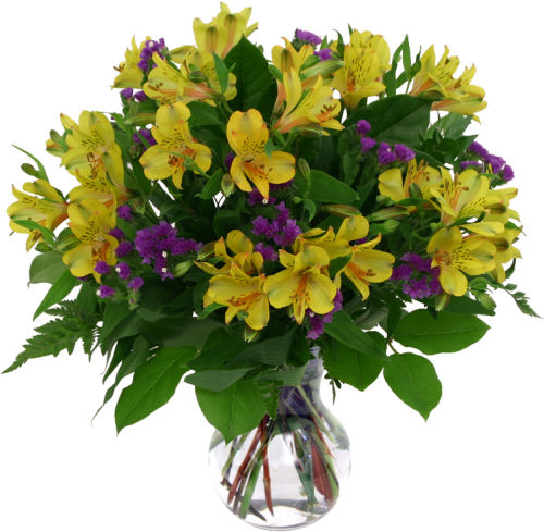 Send this delightful and dazzling combination of yellow alstroemerias with blue statice and greens, artfully arranged in a clear glass vase. The Standard Arrangement ($49.99)
