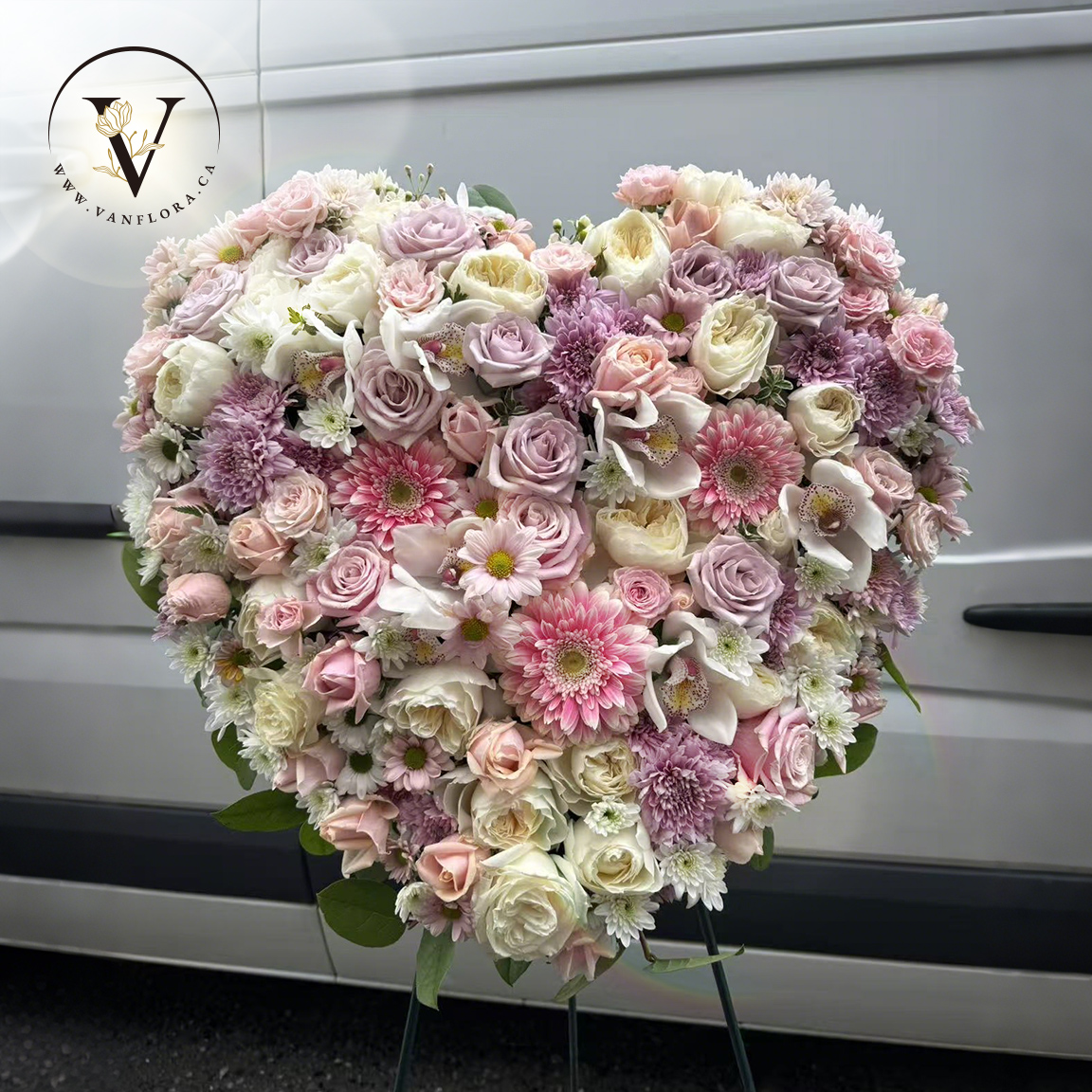 Remember a loved one’s generous heart with this arrangement in a classic heart shape, a declaration of eternal love and devotion. Solid crème lavender/white roses matched with Gerbera, daisies, carnations are surrounded by variegated greens and fern.