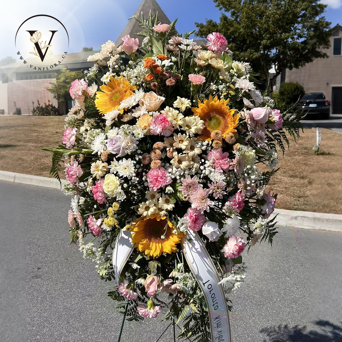 Love Lives On Standing Spray. This spray features white roses, pink carnations, mini-Carnations, yellow mums, yellow sunflowers, gypsophila and green leaf.