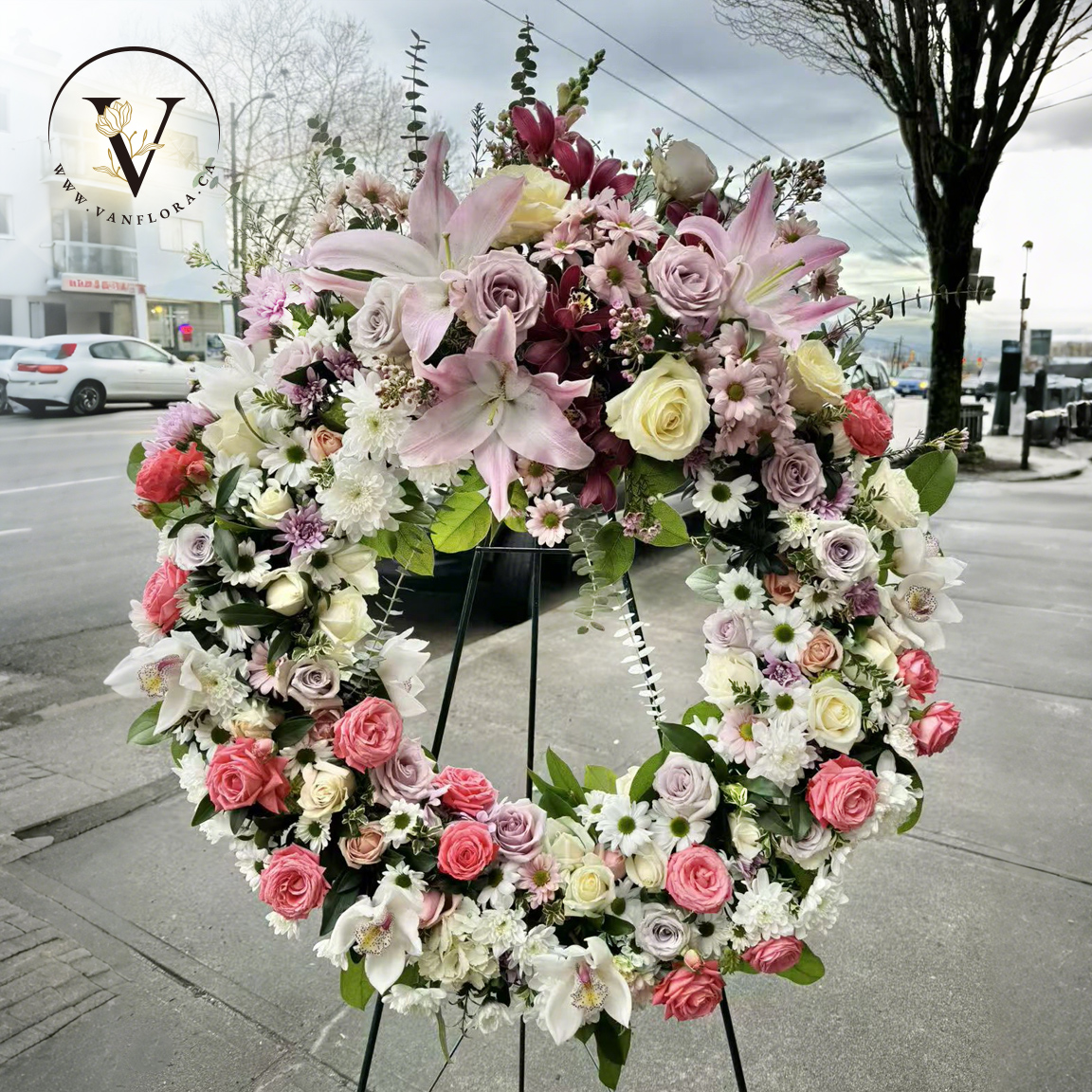 Show your love and support with this beautiful wreath of colourful mixed flowers. Its bright hues will lovingly grace the service. Each wreath is decorated with pink carnations, Roses and lily , lavender, white and yellow chrysanthemums, plus colourful fillers and soft foliage. The wreath is delivered on an easel.
