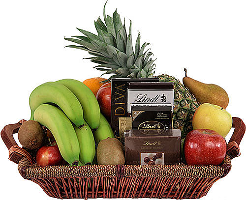 A handsome handled wicker tray is filled with popular, assorted fresh fruit plus a selection of Lindt or similar chocolates. Together, fruit and chocolate make “sweet perfection”.