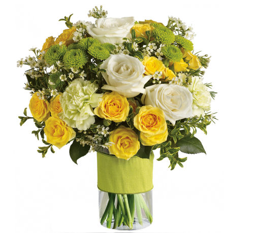 There are flowers, and then there are FLOWERS! This spectacular bouquet is the latter, bursting with sunny blooms – yellow and white roses, green mums and more. Hard to believe that one vase could hold so much beauty. Share it with someone special.