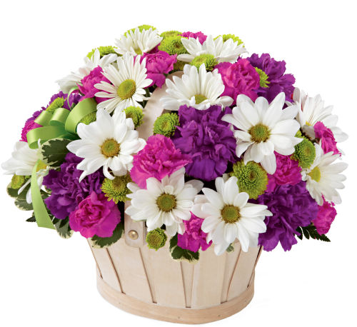 This cute cake arrangement is made up of yellow roses, orange spray roses, red miniature carnations, white cushion spray chrysanthemums, blue sinuata statice, and israeli ruscus. Delivered on a designer tray.